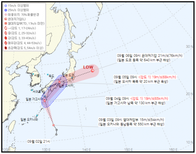 이 예상경로에 따르면 제34호 열대저압부는 4일 오전 3시쯤 일본 가고시마 남쪽 약 280km 부근 해상에서 제15호 태풍 '페이파'로 발달한다. 5일쯤 일본에 상륙한 '페이파'는 오사카와 도쿄를 훑고 6일 새벽에 도쿄 동북동쪽 580km 해상으로 빠져나가는 것으로 돼 있다...더보기