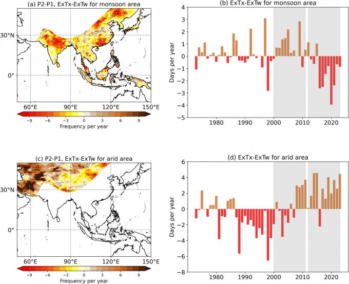 최근 10년간 아시아 대륙에서 발생하는 폭염이 지역에 따라 뚜렷하게 다른 양상을 보이고 있다. 광주과학기술원(GIST) 환경·에너지공학과 윤진호 교수 연구팀이 아시아 전역의 폭염 현상을 정밀 분석한 결과, 한반도를 포함한 몬순지역은 고온다습한 '습한 폭염'이 빠르게 증가하고 있고, 중앙아시아 등 건조지역에서는 습도가 낮은 '건조 폭염'이 강해지고 있다고 6일 밝혔다...더보기
